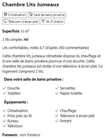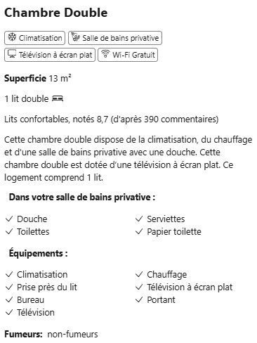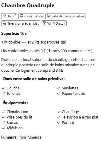| Équipements chambres | Climatisation, Insonorisation, TV écran plat (Chromecast), Bureau, Douche italienne. |