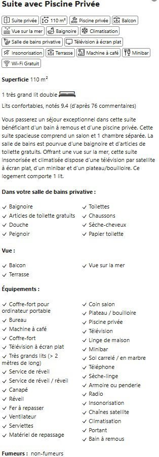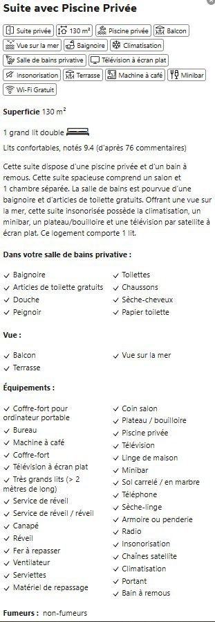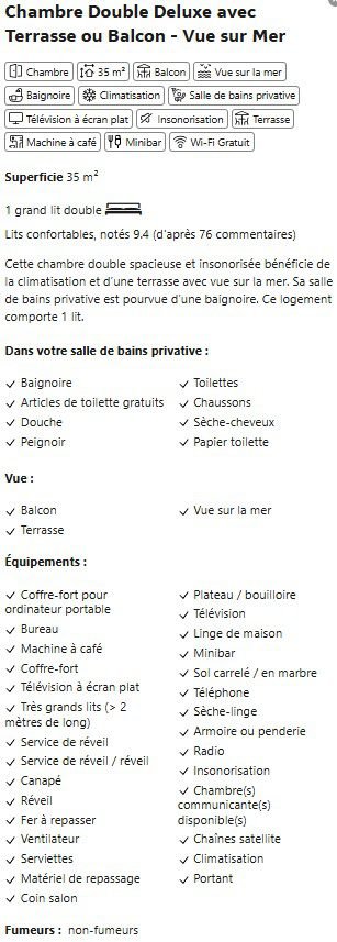 | Équipements chambres | Climatisation, Minibar, Coffre-fort, TV satellite, Peignoirs, Produits d’accueil |