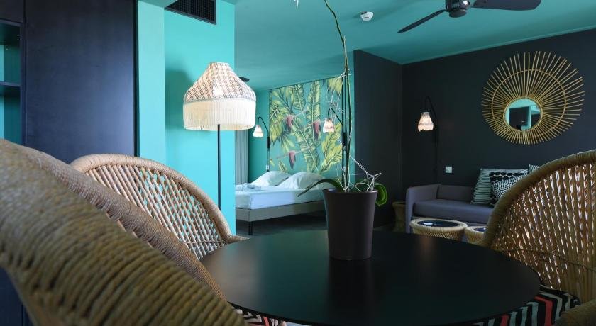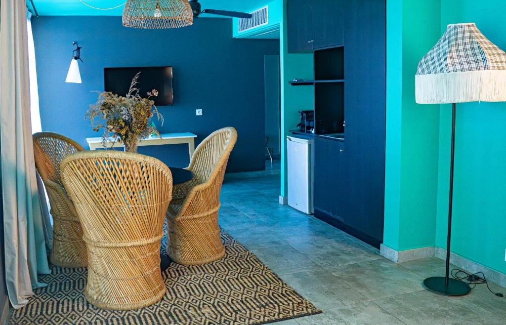 Cette suite spacieuse est le fleuron de l’établissement. Elle se compose d’une chambre séparée avec un très grand lit double et d’un salon indépendant avec canapé-lit. Dotée d’un grand balcon offrant une vue panoramique sur la piscine, elle propose un confort supérieur avec minibar et un espace de vie généreux.
