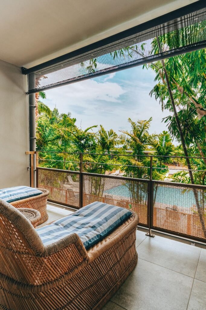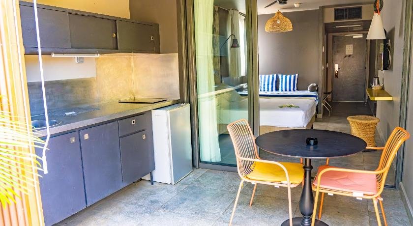 Identique à la version triple mais optimisée pour deux personnes, cette chambre supérieure offre un lit double et une kitchenette privative en terrasse. Elle allie le luxe d’un service hôtelier à la liberté d’un studio équipé, le tout avec une vue relaxante sur les jardins tropicaux.