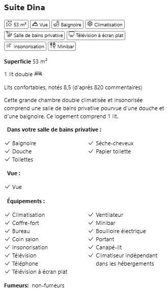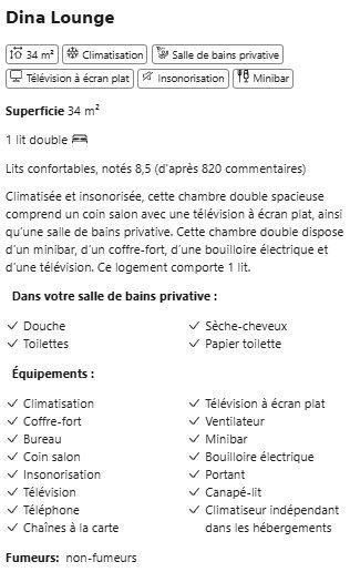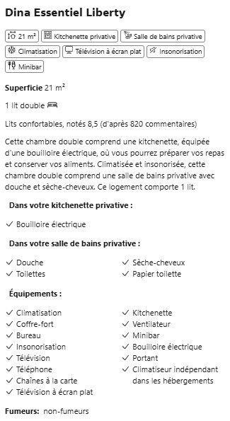 | Équipements chambres | Climatisation, Minibar, TV écran plat (streaming), Insonorisation, Kitchenette (Liberty). |