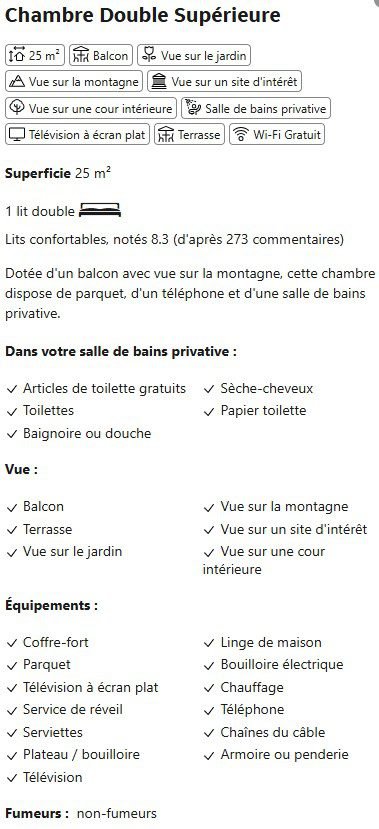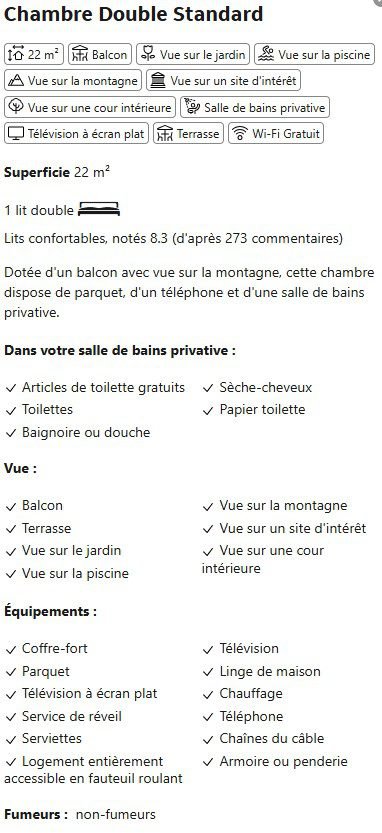 | Chambres | Télévision à écran plat, Téléphone, Salle de bains privative, Balcon/Terrasse. |