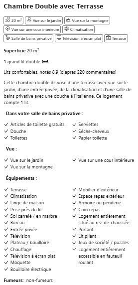 L’établissement Les Géraniums propose des chambres situées au rez-de-chaussée pour faciliter l’accès. L’enregistrement (check-in) se fait à partir de 14h00 et le départ (check-out) doit être effectué avant 11h00. Une taxe de séjour locale est applicable par nuit et par adulte. Le parking privé est gratuit pour tous les clients. Les animaux de compagnie ne sont pas admis. Les conditions d’annulation dépendent de la politique de réservation choisie sur Booking ou TripAdvisor.