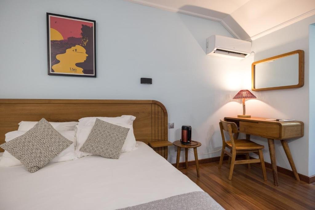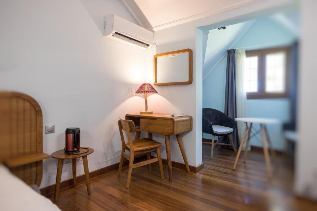 Cette unité de 20 m² dispose d’un grand lit double et d’une agréable terrasse privée pour profiter de l’air pur des hauts. Équipée de la climatisation, d’une télévision et d’une salle de bains moderne, elle offre une vue imprenable sur la cour intérieure et les remparts. Un choix privilégié pour les couples séjournant à l’Hôtel Les Géraniums lors de leur tour de l’île de la Réunion.