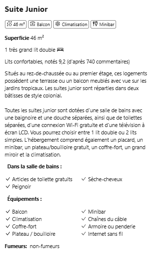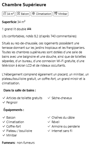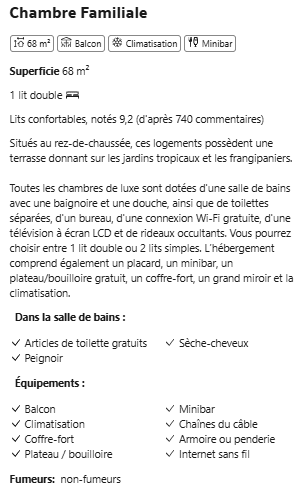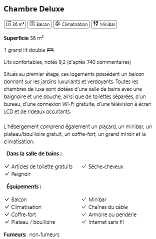 | Chambres | Climatisation, Minibar, Coffre-fort, Smart TV, Machine à café |
