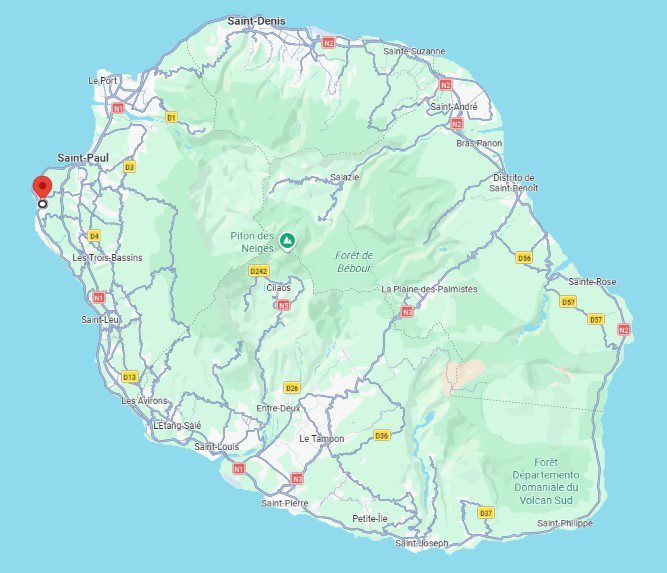 Saint-Gilles-les-Bains se situe sur la côte ouest de l’île de La Réunion, au sein de la commune de Saint-Paul. Protégée par les montagnes du Maïdo, cette zone bénéficie d’un microclimat sec et ensoleillé toute l’année. À environ 45 minutes de l’aéroport Roland-Garros, la station est facilement accessible via la Route des Tamarins, reliant le nord au sud de l’île en un temps record.