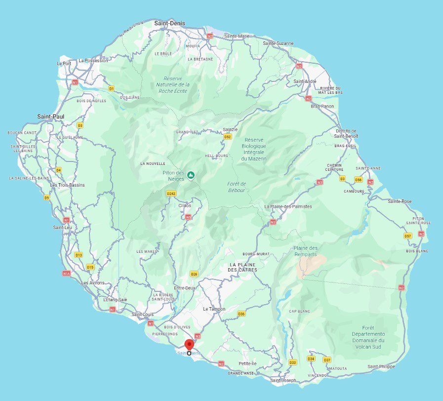 Saint-Pierre occupe une position centrale sur la côte sud de La Réunion. Elle est située à environ 1h15 de l’aéroport Roland-Garros via la Route des Tamarins, mais dispose également de son propre aéroport (Saint-Pierre Pierrefonds) pour les liaisons régionales. C’est le véritable carrefour logistique du Sud, facilitant l’accès aux montagnes et au littoral sauvage.