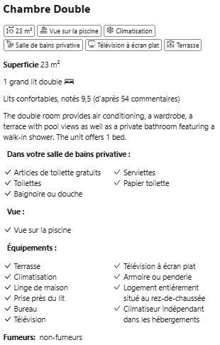 | Loisirs & Détente | Piscine extérieure, Terrasse solarium, Jardin tropical, Salon commun. |