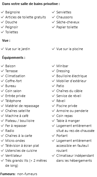 Le Palm Hotel & Spa est entièrement accessible aux personnes à mobilité réduite, avec des ascenseurs et des chambres aménagées. L’enregistrement (check-in) s’effectue à partir de 14h00 et le départ (check-out) avant 11h00. Une taxe de séjour est à régler sur place. Le parking privé est gratuit et surveillé. Les animaux de compagnie ne sont pas admis. Les conditions d’annulation sont régies par Booking ou Hoteles.com selon l’offre choisie.