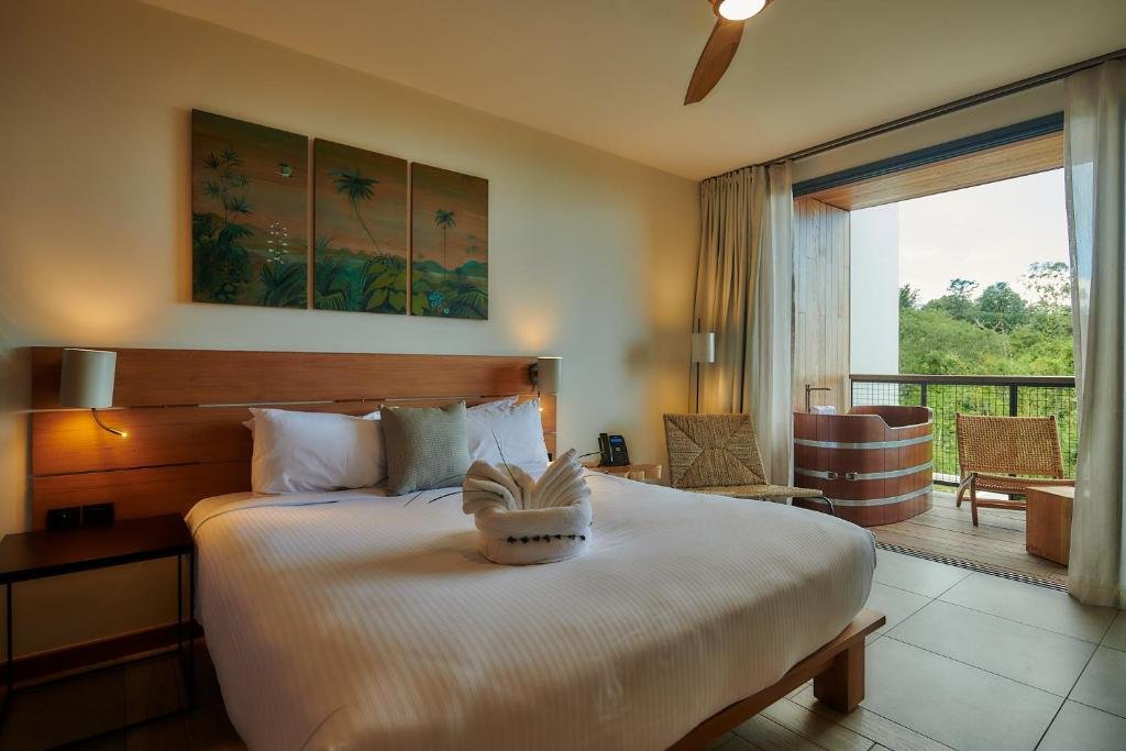 D’une surface de 28 m², cette chambre est le summum du romantisme. Elle dispose d’une baignoire spa privative, d’un balcon avec vue mer et d’un grand lit double. Une expérience de luxe ultime pour les couples visitant L’Étang-Salé Réunion dans cet hôtel doté d’équipements haut de gamme.