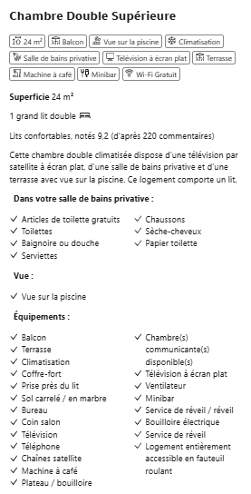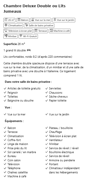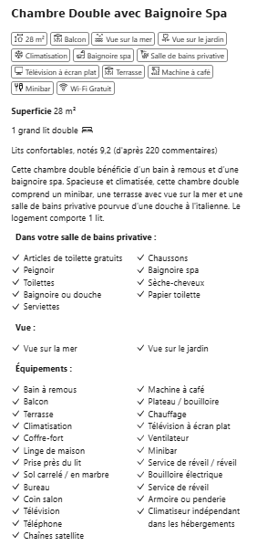| Spa & Bien-être | Spa complet, Baignoire spa, Massages, Sauna, Hammam. |