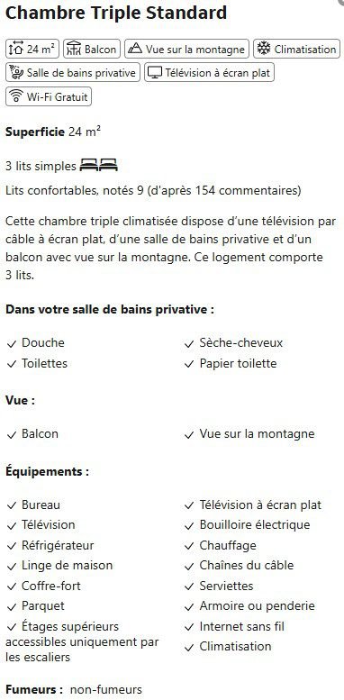 | Extérieurs | Balcon ou terrasse (selon chambre), Vue montagne ou ville. |