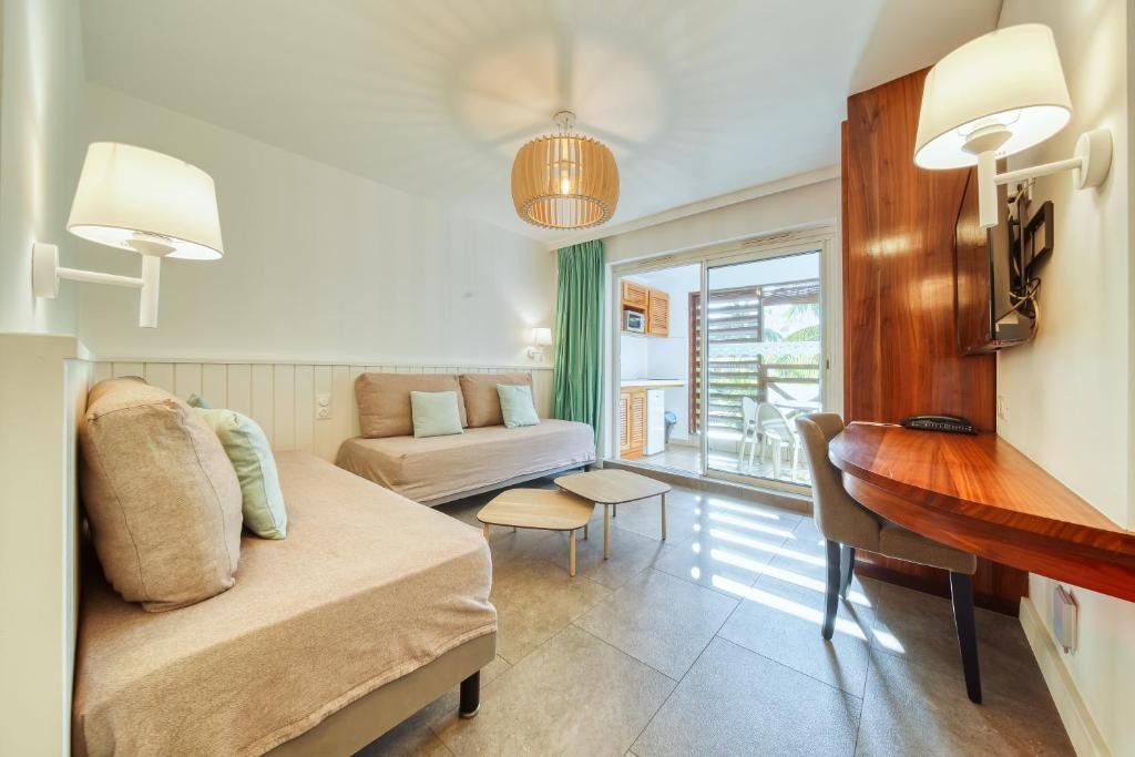 Le Tropic Appart’Hôtel se trouve à seulement 80 mètres de la plage de l’Ermitage, offrant un accès immédiat à la baignade sécurisée dans le lagon.