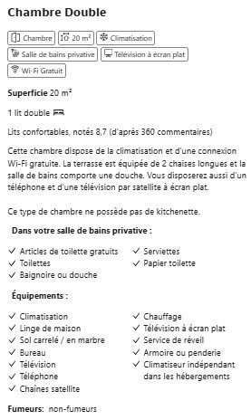 | Confort | Climatisation, Coffre-fort, TV satellite, Téléphone, Sèche-cheveux |