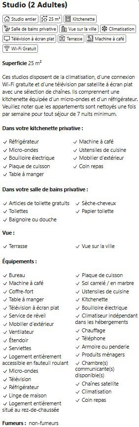 L’établissement est accessible aux personnes à mobilité réduite et propose des studios aménagés au rez-de-chaussée. Les tarifs incluent l’hébergement et l’accès à la piscine. La taxe de séjour de 1,50 € par personne et par nuit est à régler sur place. L’enregistrement s’effectue à partir de 14h00 et le départ jusqu’à 11h00. La politique d’annulation permet une flexibilité jusqu’à 48h avant l’arrivée pour les tarifs standards. Un parking privé est mis gratuitement à disposition des clients. Les animaux de compagnie ne sont pas admis.