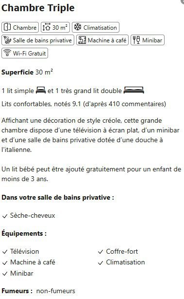 Idéale pour les petits groupes ou les familles, cette chambre spacieuse de 30 m² comprend un lit simple et un très grand lit double. Entièrement climatisée, elle offre tout le confort moderne avec minibar et machine à café, garantissant une expérience reposante au cœur de ce resort à La Réunion situé en haute altitude.
