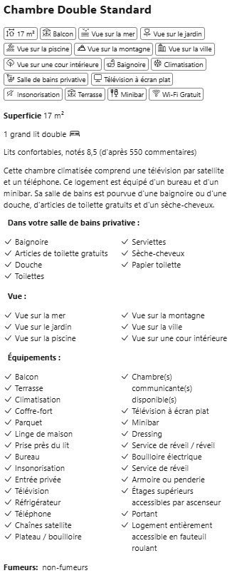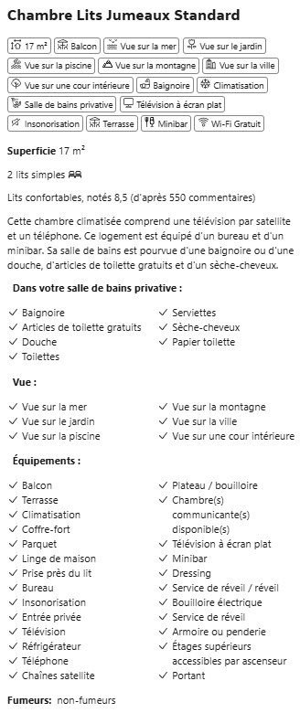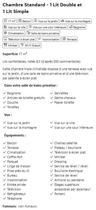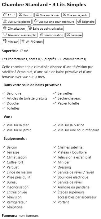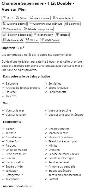 | Équipements chambres | Climatisation, Balcon/Terrasse, Baignoire, Minibar, TV écran plat. |