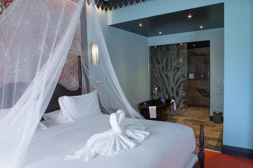 Ces suites de 44 m² offrent un espace de vie luxueux avec un coin salon intégré. Elles disposent d’une vaste terrasse panoramique face au lagon. Équipées de technologies modernes et d’un service de courtoisie premium, elles représentent le summum de l’élégance dans ce resort à La Réunion, idéales pour les séjours romantiques ou les voyageurs en quête d’exclusivité.