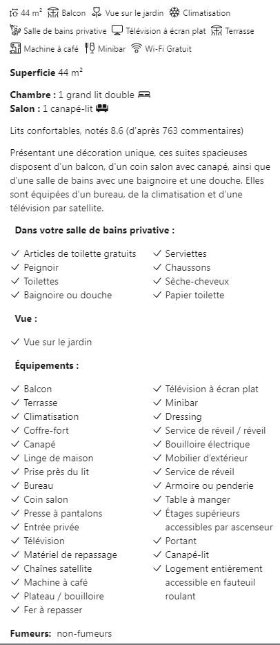 | Équipements chambres | Climatisation, Minibar, Coffre-fort, TV satellite, Machine à café (Deluxe/Suites). |