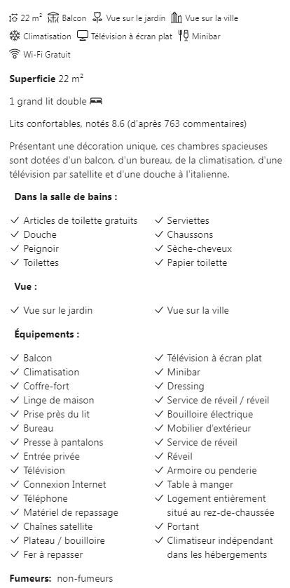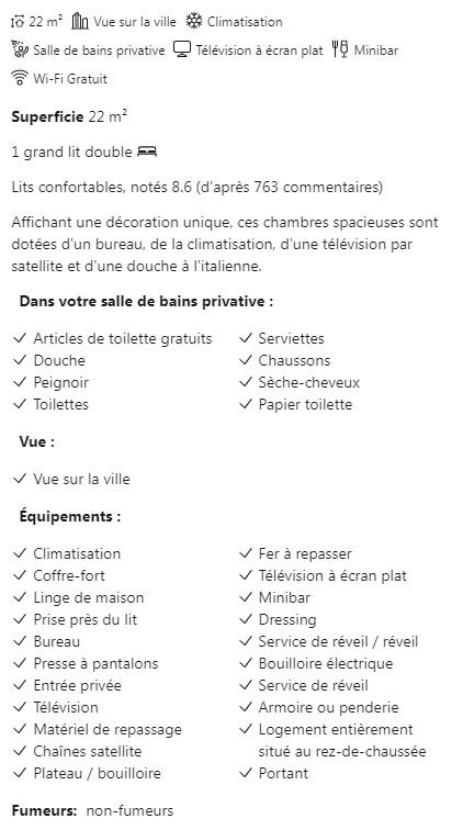 | Services | Wi-Fi gratuit haut débit, Réception 24h/24, Conciergerie, Parking privé gratuit, Blanchisserie. |