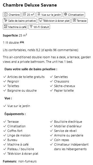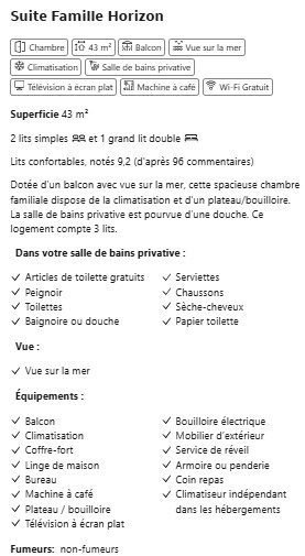 L’établissement est conçu pour être accessible aux personnes à mobilité réduite, avec des cheminements adaptés et des suites spécifiques. Les tarifs incluent l’accès à la piscine chauffée. La taxe de séjour est à régler sur place (environ 2,50 € par adulte). L’enregistrement commence à 15h00 et le départ s’effectue jusqu’à 11h00. La politique d’annulation varie selon les périodes (consulter lors de la réservation). Le parking privé est gratuit pour les clients. Les animaux domestiques ne sont généralement pas admis pour garantir la tranquillité du lieu.