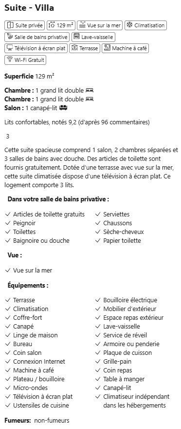 Sommet du luxe au Wood Hôtel, cette villa entière de 154 m² dispose de trois chambres séparées (3 grands lits doubles) et d’un salon avec canapé-lit. Elle offre une autonomie totale avec une cuisine équipée, un lave-vaisselle et quatre salles de bains. Sa terrasse panoramique sur la mer et ses équipements de standing assurent une expérience inoubliable pour les groupes ou les familles exigeantes.